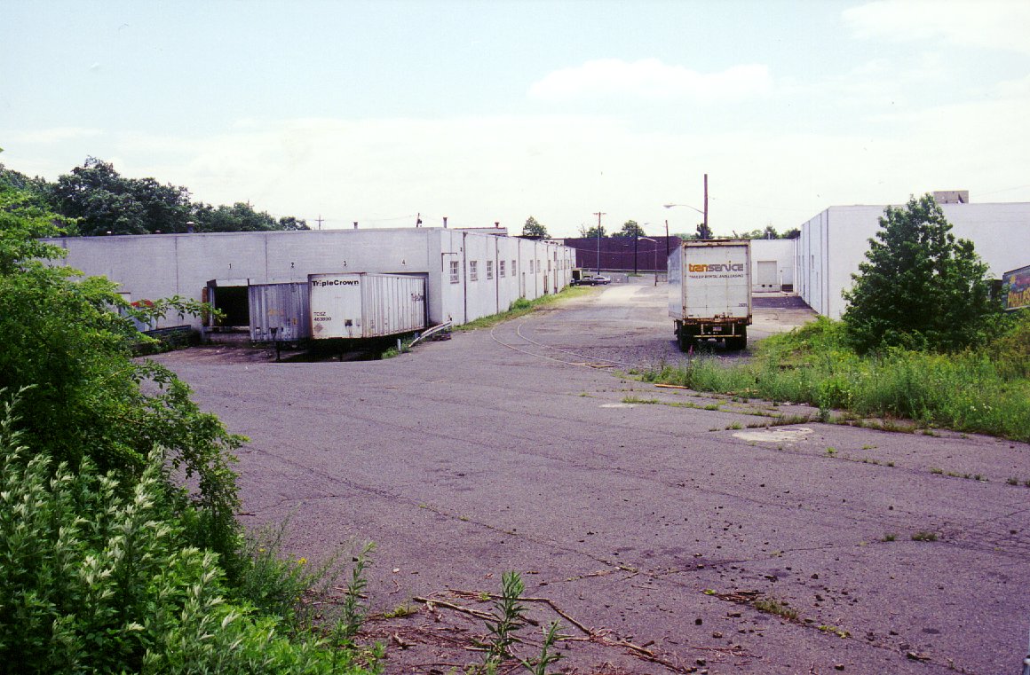 This industrial trackage was served from both the east and west end. However, the east end connection was torn out recently. Also, there is another (still-connected) siding here swinging off to the right to serve a food-service warehouse. The track looks like it hasn't been used in a while. This siding was put in after EL, according to the diagram book. Time for another aerial view of this area taken April 19, 1990. We crossed under Riverview Drive, and came to the only real "bright spot" on this hike: The last remaining customer!